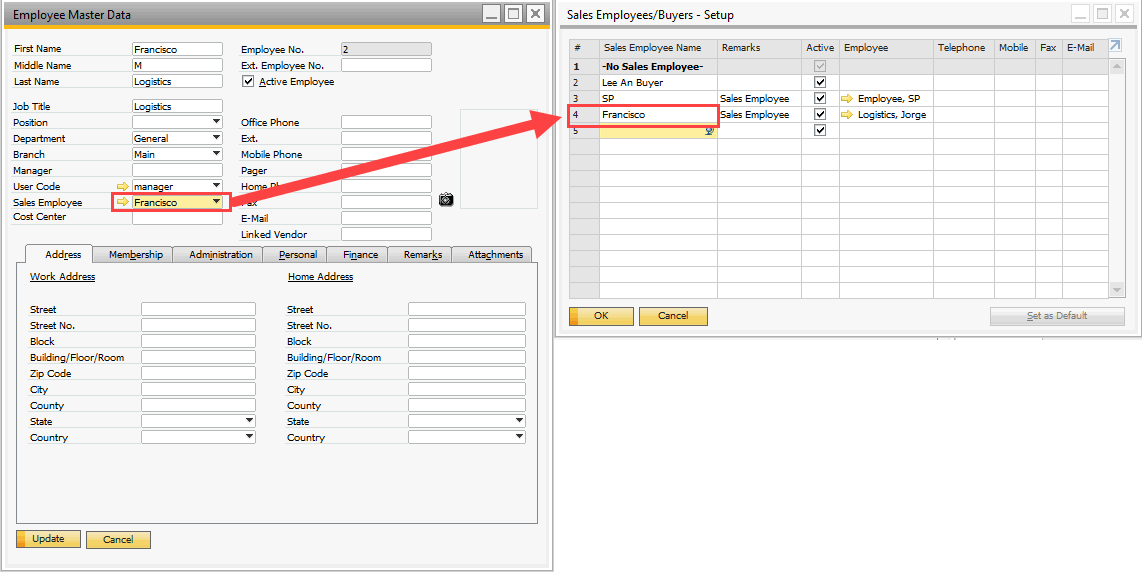 This is an example to represent how the connection between Sales Employee and SAP Employee must be set.