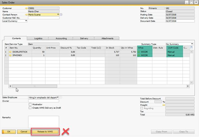 The Documents (Sales Orders and/or Inventory Transfers) must be generated in SBO and NOT Released to WMS.The Warehouse must be indicated in the Documents. If the Item uses a unit of measure group, indicate the UoM in the Document.