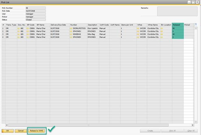 The Picklist must be created in SBO indicating the items and quantity released. The picklist must be Released to WMS.
